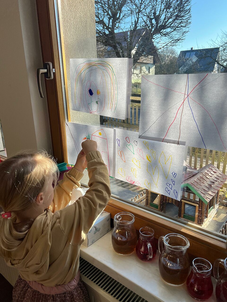 Mit viel Kreativität und Begeisterung haben die Kinder unsere Fenster gestaltet. Überall leuchten nun Herzen, Blumen und frische Farben und bringen die Sonne direkt in unsere Räume.
