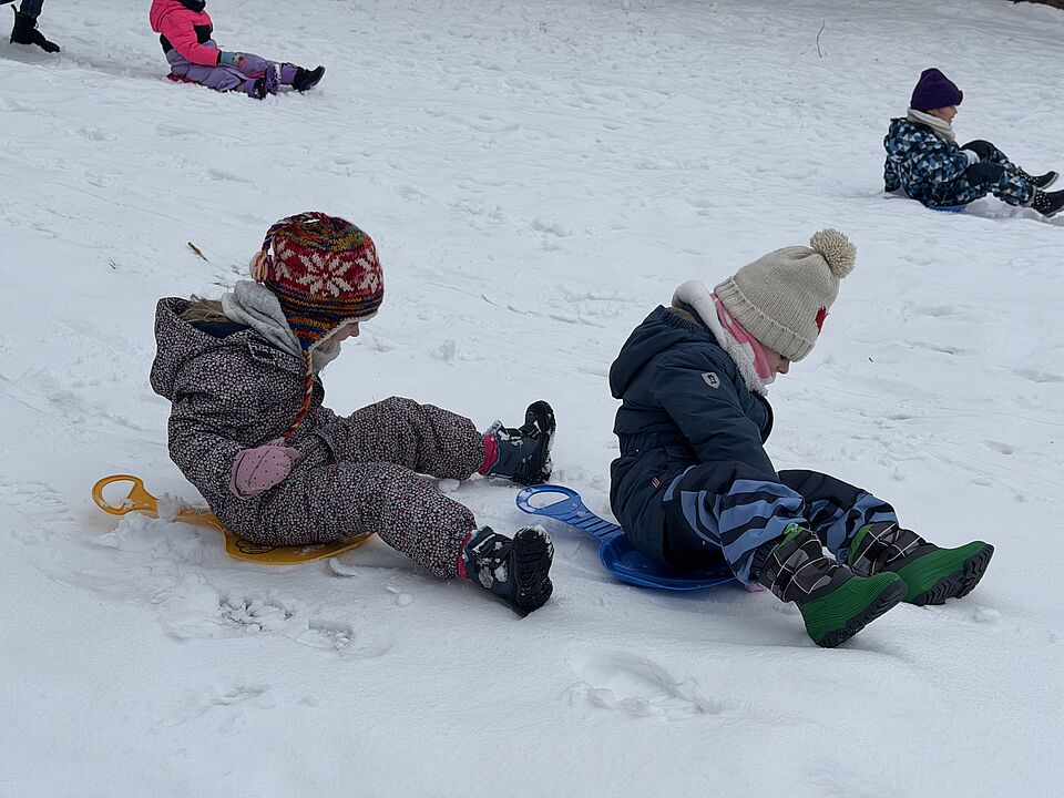 Neben dem Schlittenfahren entdeckten die Kinder auch die winterliche Natur: Sie bestaunten die vereisten Äste, hinterließen Fußspuren im Schnee, ließen Schneeengel entstehen und formten kleine Schneebälle.